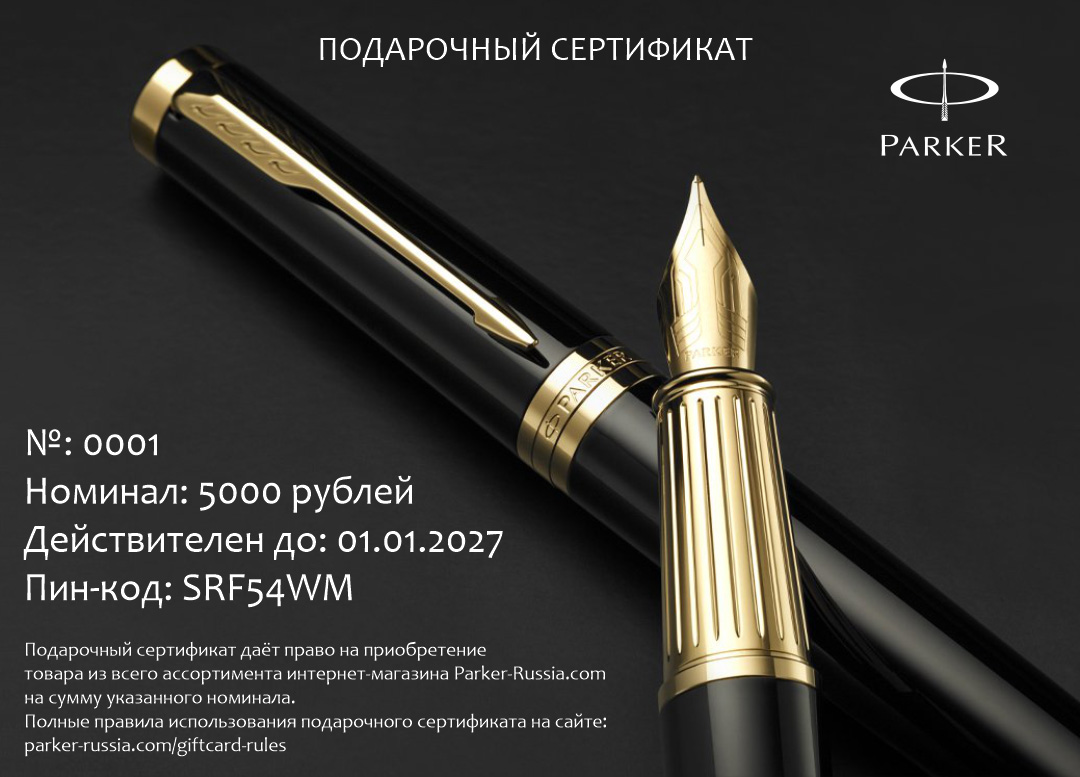 Подарочный сертификат Parker 5000 от официального дилера Parker в Черкесске. Вы можете дополнительно заказать гравировку, которая подчеркнет Вашу оригинальность и придаст памятность статусному подарку. Все ручки Паркер поставляются в фирменном футляре.